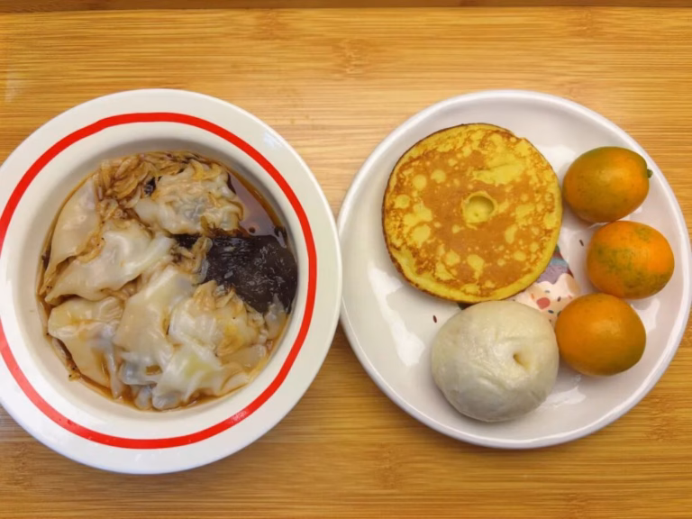 ✅10.紫菜虾滑馄饨+山药鸡蛋饼+小笼包+金桔