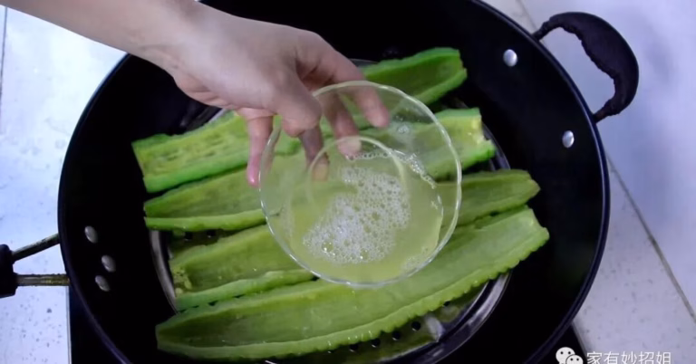 蒸屉上水开以后 , 把处理好的苦瓜放上去 , 先倒蛋清 , 不用倒太多 , 底部有一层就行 , 盖上盖子大火蒸三分钟 , 让蛋白凝固!